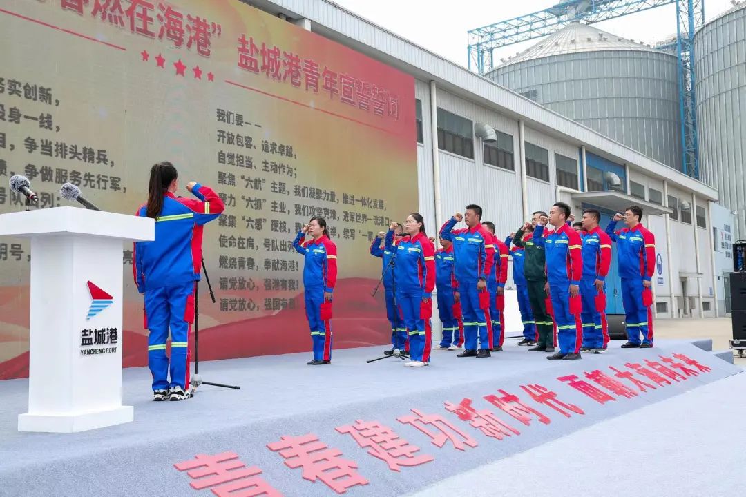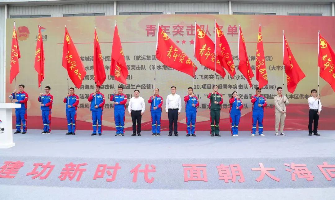 活動中,與會領導為12個圍繞服務重大項目而組成的青年集體突擊隊進行授旗,青年突擊隊、青年文明號代表作表態(tài)發(fā)言,并舉行了“強國復興有我 青春燃在海港”鹽城港青年宣誓儀式。