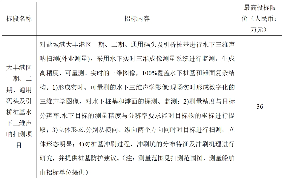 (1)項目名稱:大豐港區一期、二期、通用碼頭及引橋樁基水下三維聲吶掃測項目。