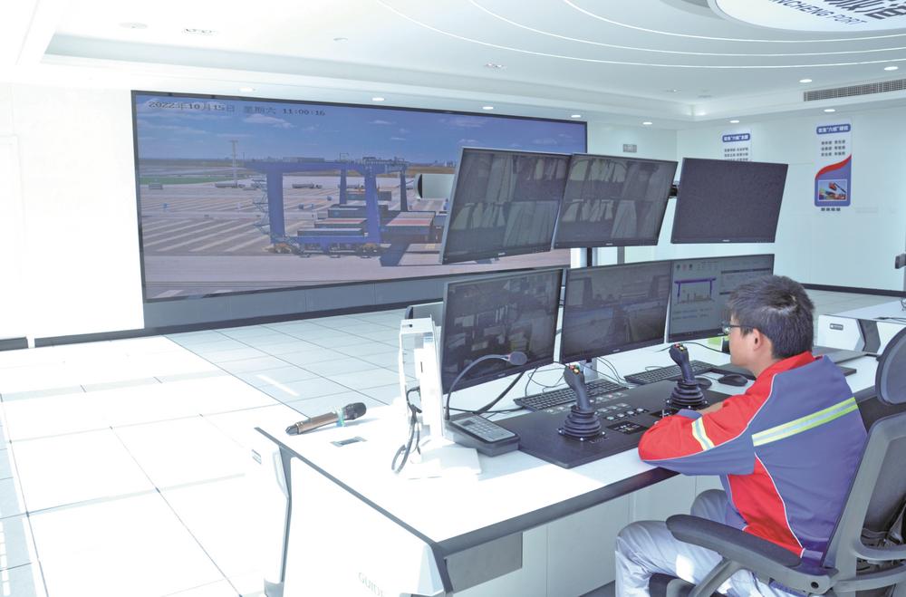 新技術帶來新變革,自動化碼頭便捷的操作、舒適的環境,改變了單人單機操作重型起重設備的歷史。在整個項目的“大腦”——中控室里,操作系統發出指令,新能源電動集裝箱卡車前往堆場,兩名軌道吊司機遠程監控著4臺自動化軌道吊,精準定位,瞬間完成抓箱、落箱,集裝箱“一鍵著箱”精準無誤。偌大的堆場,除了集裝箱卡車司機,看不到其他工作人員。